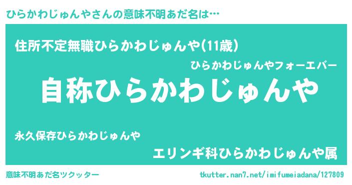 | 男性向けラノベタイトル風あだ名 | 『Re:ひらかわじゅんやから始める異世界生活』 |