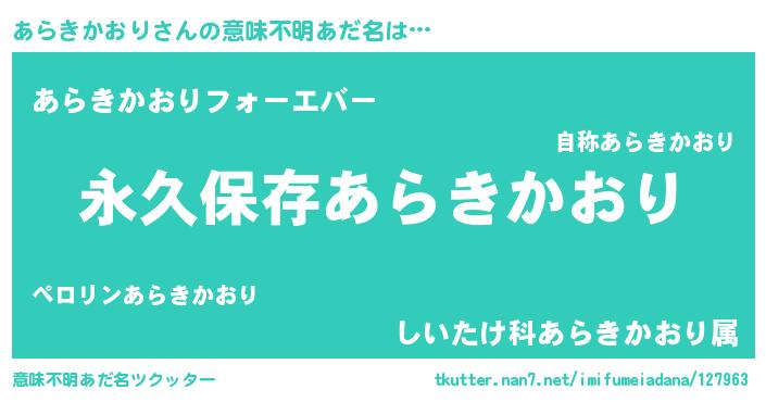 | 女子向けラノベタイトル風あだ名 | 『異世界でカフェあらきかおりを開店しました。』 |