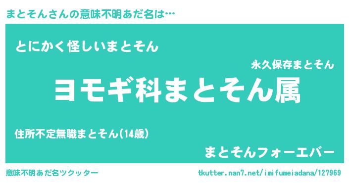 | 男性向けラノベタイトル風あだ名 | 『まとそんに滅ぼされるだけの簡単なお仕事です』 |