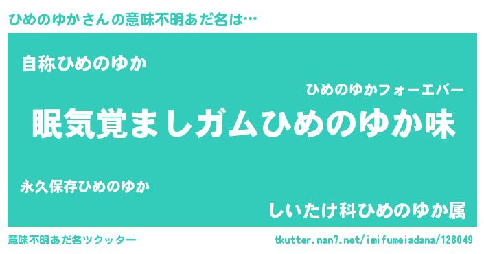 | ヒーロー風カッコイイあだ名 | 『慈愛の使者ひめのゆか』『炎刃騎士ヒメ』 |