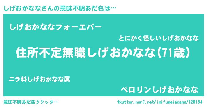 | 男性向けラノベタイトル風あだ名 | 『魔弾の王としげおかなな』 |