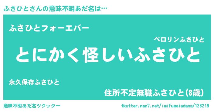 | 胡散臭い通販商品みたいなあだ名 | 『信頼と実績のサプリメント…その名も「ふさひと」』 |
