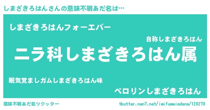 | 男性向けラノベタイトル風あだ名 | 『しまざきろはん~年齢イコール彼女いない歴の魔法使い~』 |