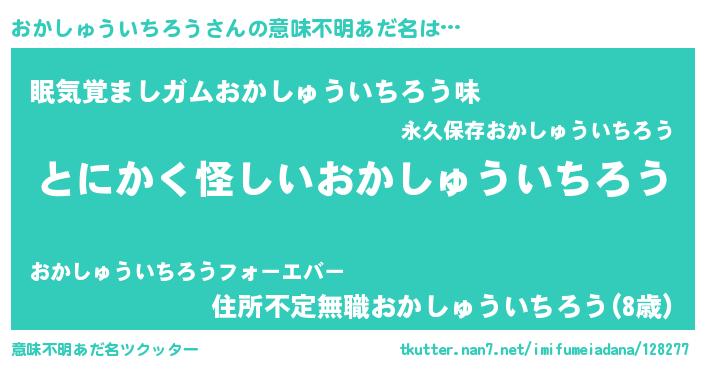 | 男性向けラノベタイトル風あだ名 | 『おかしゅういちろうに滅ぼされるだけの簡単なお仕事です』 |