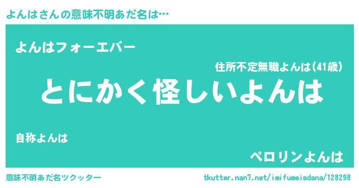 | 女子向けラノベタイトル風あだ名 | 『よんは様がみてる』『よんは伯爵の花嫁』 |