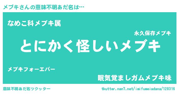 | 男性向けラノベタイトル風あだ名 | 『メブキの嫁は女の子じゃないと思った?』 |