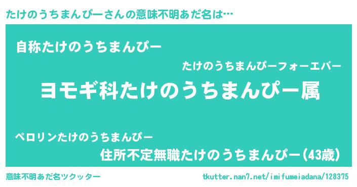 | 男性向けラノベタイトル風あだ名 | 『たけのうちまんぴー~年齢イコール彼女いない歴の魔法使い~』 |