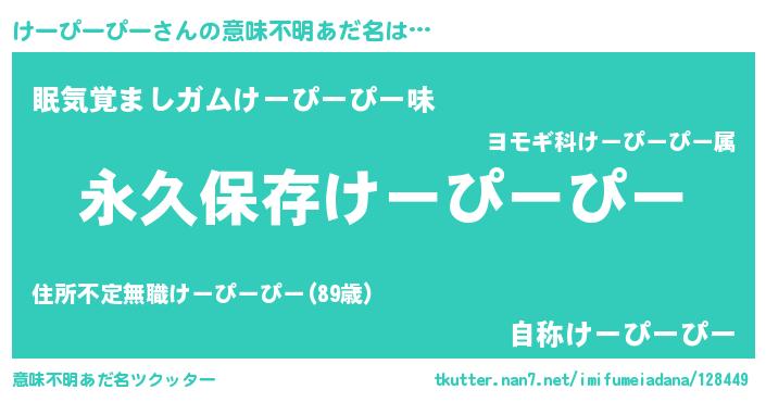 | 男性向けラノベタイトル風あだ名 | 『うちのけーぴーぴーが世界を掌握している!』 |