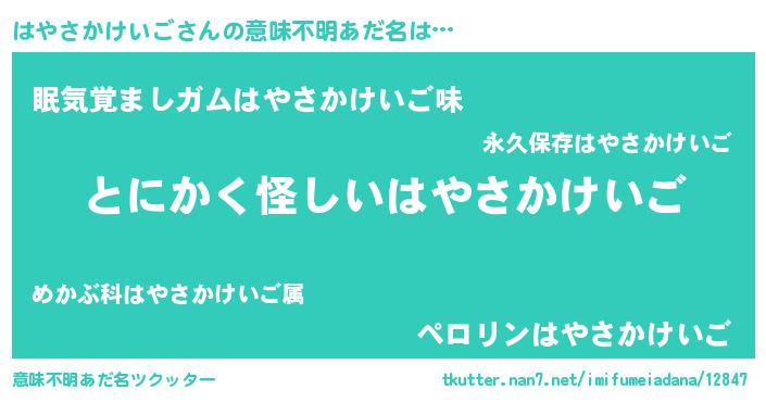 | 男性向けラノベタイトル風あだ名 | 『はやさかけいごの嫁は女の子じゃないと思った?』 |