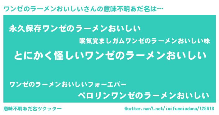 | 女子向けラノベタイトル風あだ名 | 『ワンゼのラーメンおいしいは平凡を望む』 |