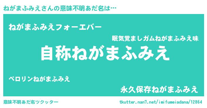 | 男性向けラノベタイトル風あだ名 | 『Re:ねがまふみえから始める異世界生活』 |