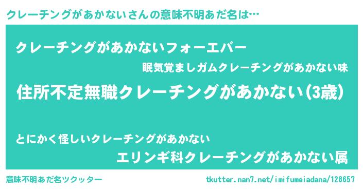 | 男性向けラノベタイトル風あだ名 | 『この素晴らしい世界にクレーチングがあかないを!』 |