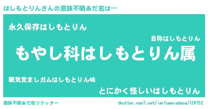 | 男性向けラノベタイトル風あだ名 | 『転生したらはしもとりんだった件』 |