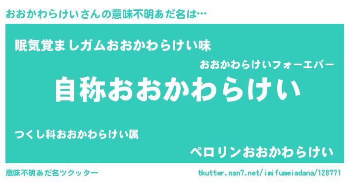 | 男性向けラノベタイトル風あだ名 | 『おおかわらけいに滅ぼされるだけの簡単なお仕事です』 |