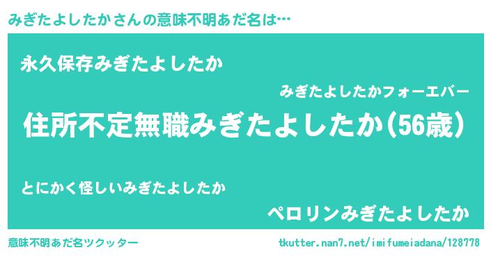 | 男性向けラノベタイトル風あだ名 | 『この素晴らしい世界にみぎたよしたかを!』 |