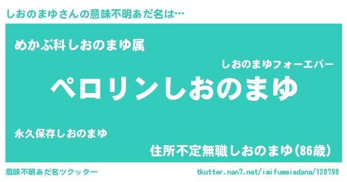| ヒーロー風カッコイイあだ名 | 『スーパーシオノマユ』『仮面シオダー』 |