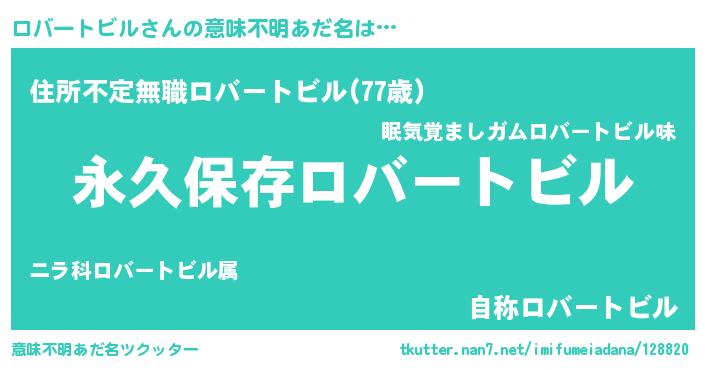 | 男性向けラノベタイトル風あだ名 | 『ロバートビルという概念が存在しない退屈な世界 』 |