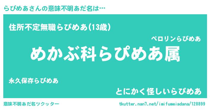 | 男性向けラノベタイトル風あだ名 | 『ラピメアスレイヤー』『らぴめあの憂鬱』 |