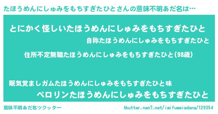 | 料理風あだ名 | 『たほうめんにしゅみをもちすぎたひとのカルパッチョ風』 |