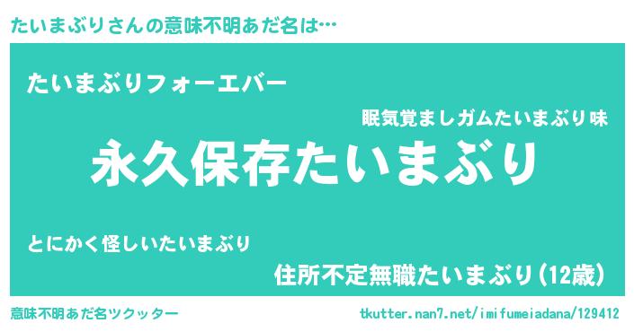 | 男性向けラノベタイトル風あだ名 | 『たいまぶりという概念が存在しない退屈な世界 』 |