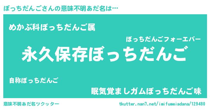 | 男性向けラノベタイトル風あだ名 | 『ぼっちだんごという概念が存在しない退屈な世界 』 |