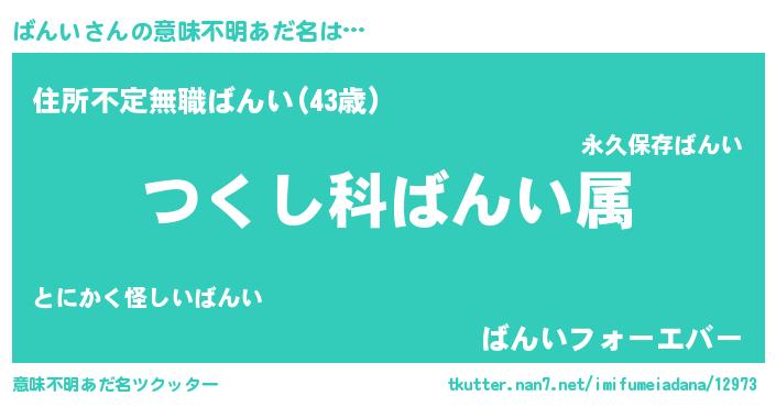 | 男性向けラノベタイトル風あだ名 | 『ばんい~年齢イコール彼女いない歴の魔法使い~』 |