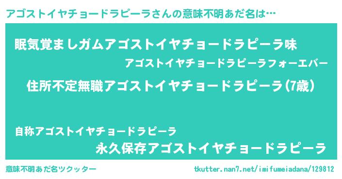 | 女子向けラノベタイトル風あだ名 | 『乙女ゲームの破滅フラグしかない悪役アゴストイヤチョードラピーラに転生してしまった…』 |