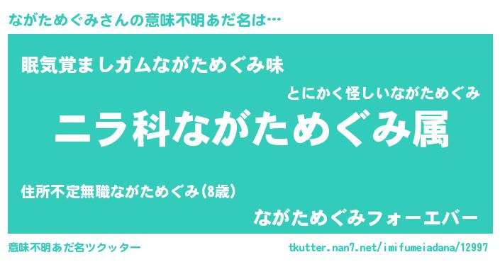 | 女子向けラノベタイトル風あだ名 | 『ながためぐみの玉の輿計画!』 |