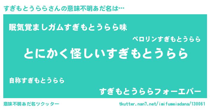 | 男性向けラノベタイトル風あだ名 | 『すぎもとうららの嫁は女の子じゃないと思った?』 |