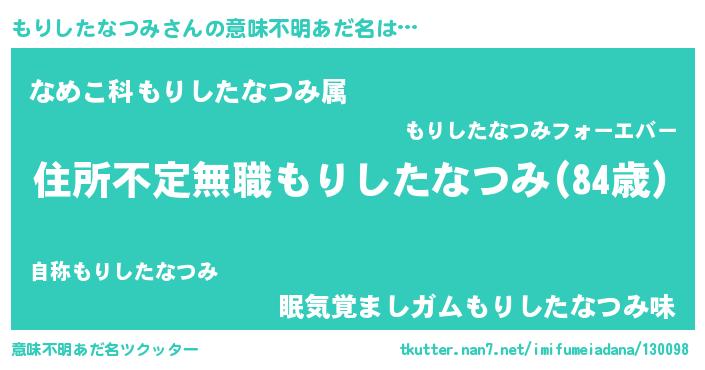 | 女子向けラノベタイトル風あだ名 | 『乙女ゲームの破滅フラグしかない悪役もりしたなつみに転生してしまった…』 |