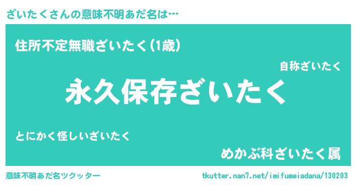 | 男性向けラノベタイトル風あだ名 | 『ざいたくという概念が存在しない退屈な世界 』 |