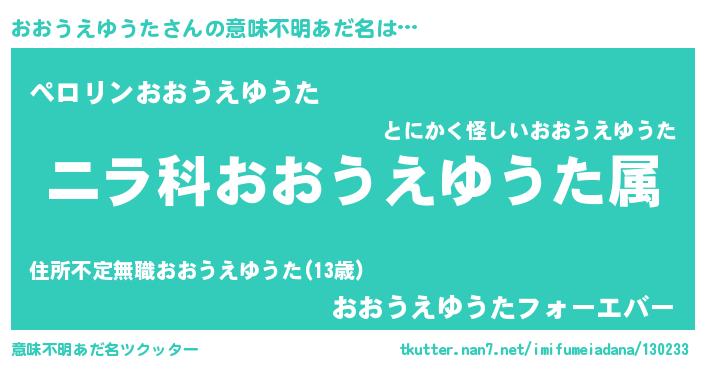 | 男性向けラノベタイトル風あだ名 | 『おおうえゆうた~年齢イコール彼女いない歴の魔法使い~』 |