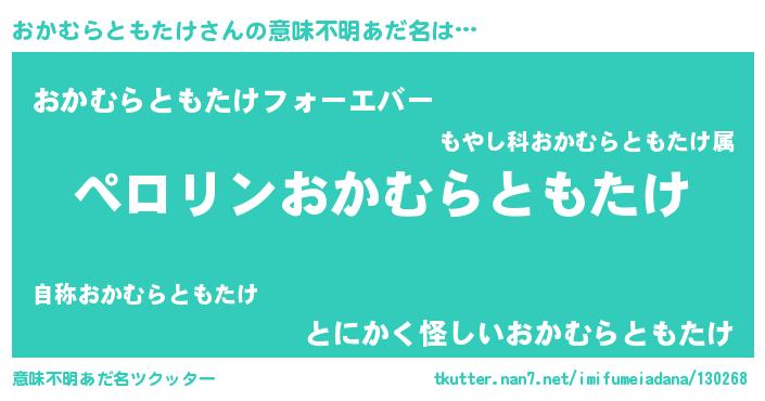 | 男性向けラノベタイトル風あだ名 | 『おかむらともたけの憂鬱』 |