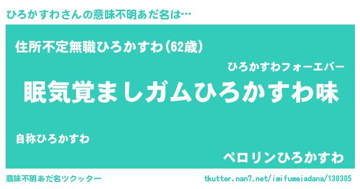 | 男性向けラノベタイトル風あだ名 | 『ひろかすわに滅ぼされるだけの簡単なお仕事です』 |