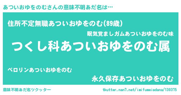 | 男性向けラノベタイトル風あだ名 | 『あついおゆをのむ~年齢イコール彼女いない歴の魔法使い~』 |