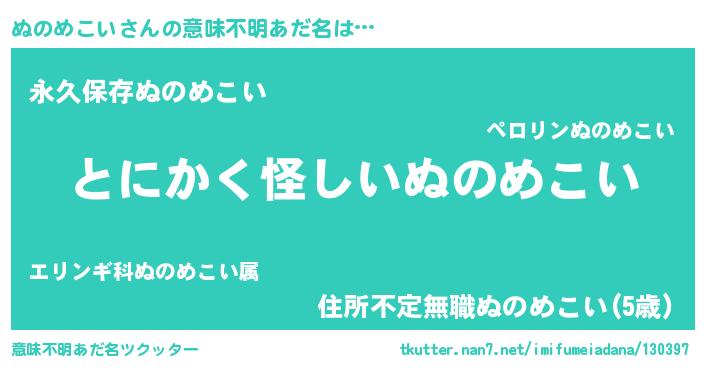 | 女子向けラノベタイトル風あだ名 | 『ぬのめこいの卵を拾いまして』 |