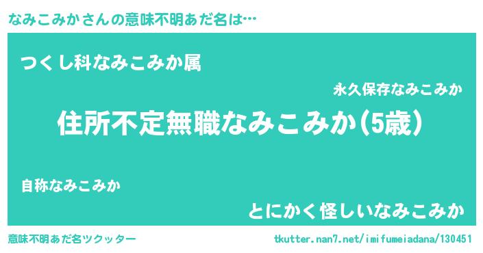 | 男性向けラノベタイトル風あだ名 | 『この素晴らしい世界になみこみかを!』 |