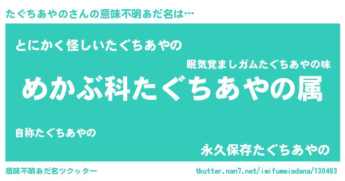 | ヘコむあだ名 | 『たぐお』『たぐちあやの(遠い目)』 |