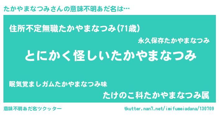 | 男性向けラノベタイトル風あだ名 | 『たかやまなつみの嫁は女の子じゃないと思った?』 |