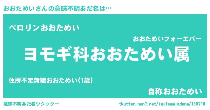 | 男性向けラノベタイトル風あだ名 | 『うちのおおためいが世界を掌握している!』 |