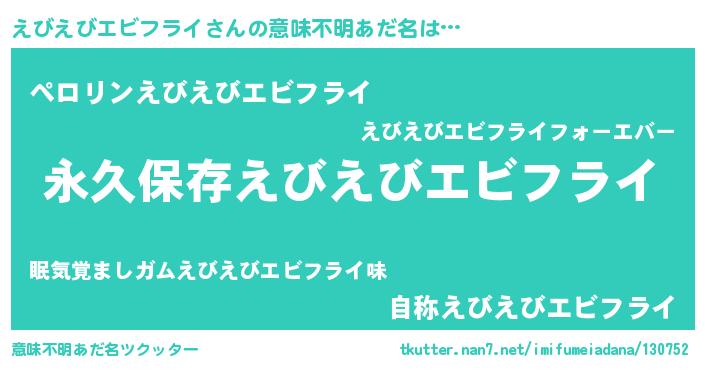 | 男性向けラノベタイトル風あだ名 | 『えびえびエビフライという概念が存在しない退屈な世界 』 |