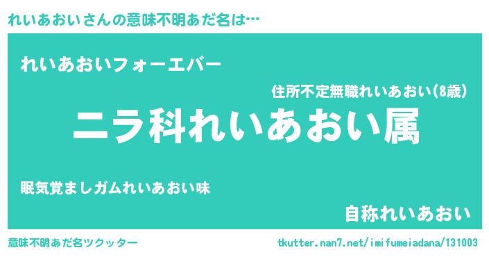| 男性向けラノベタイトル風あだ名 | 『れいあおい~年齢イコール彼女いない歴の魔法使い~』 |