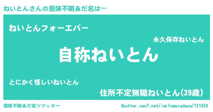 | 男性向けラノベタイトル風あだ名 | 『Re:ねいとんから始める異世界生活』 |