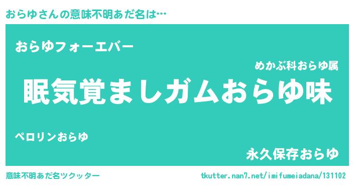 | ヒーロー風カッコイイあだ名 | 『慈愛の使者おらゆ』『ネオオラユ』 |