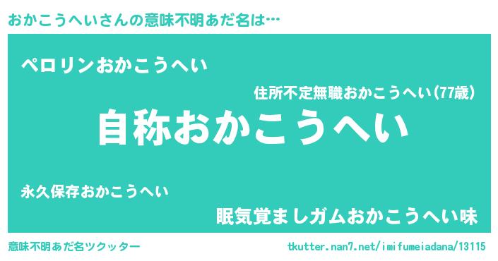 | 男性向けラノベタイトル風あだ名 | 『Re:おかこうへいから始める異世界生活』 |