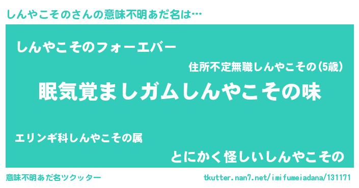 | 男性向けラノベタイトル風あだ名 | 『ノーゲーム・ノーシンヤコソノ』 |