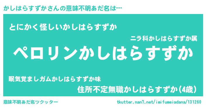 | 胡散臭い通販商品みたいなあだ名 | 『億万長者になれるブレスレット…その名も「かしはらすずか」』 |