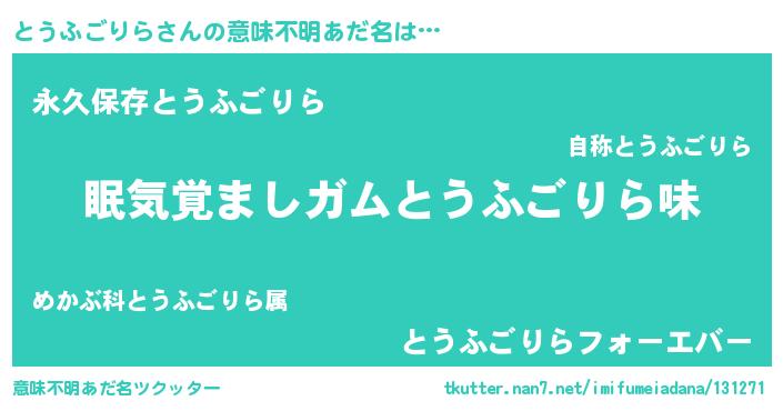 | 男性向けラノベタイトル風あだ名 | 『おまえをオタクにしてやるから、俺をとうふごりらにしてくれ! 』 |