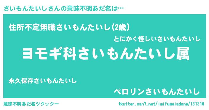 | 男性向けラノベタイトル風あだ名 | 『さいもんたいし~年齢イコール彼女いない歴の魔法使い~』 |
