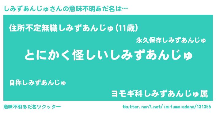 | 男性向けラノベタイトル風あだ名 | 『しみずあんじゅの嫁は女の子じゃないと思った?』 |